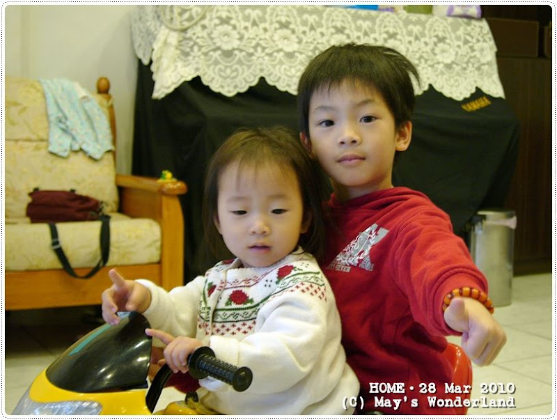 禮拜天沒行程,早上等邱爸爸去游泳回來的時間,兩個小的在家裡玩瘋狂飆車族遊戲。哥哥載著妹妹騎摩托車(不是電動、是用腳推喔),也可以飆得超快,媽媽我覺得危險,想把小眉抱起來她還不肯。我不禁擔心起,這小妮子十八歲時可能會跟男友騎車私奔去、不理老媽了…嗚! 邱爸爸游泳回來後,也已經中午了,我們就到蘆洲國安叔叔那裡(歐圖親子廚房)去吃中餐。